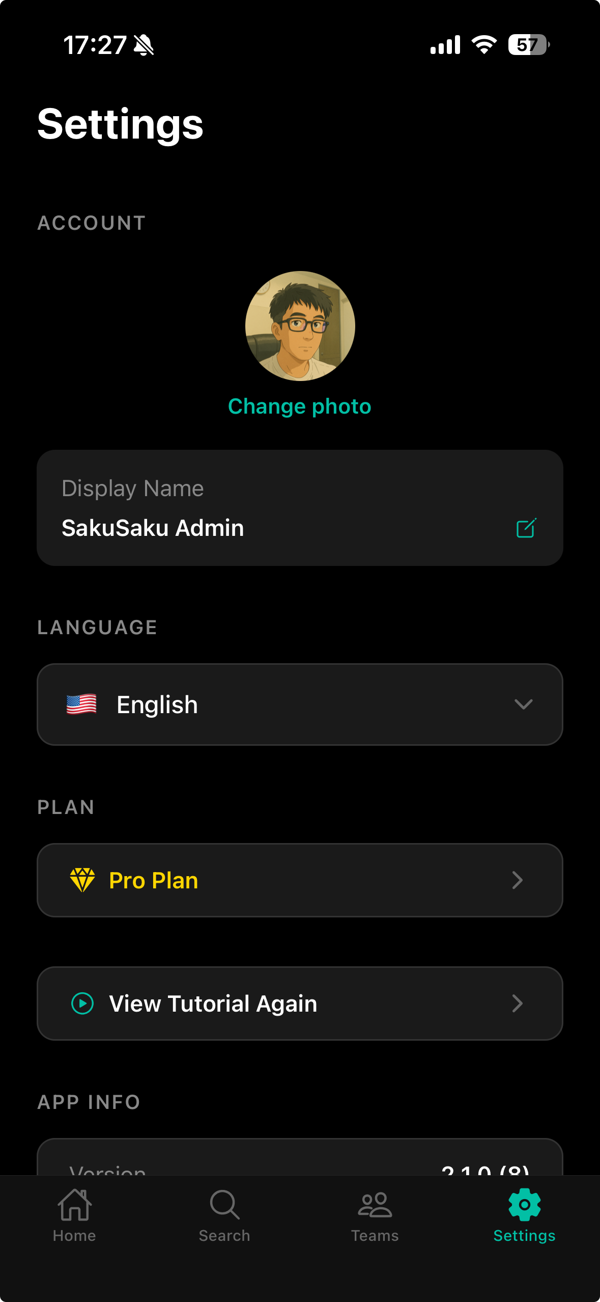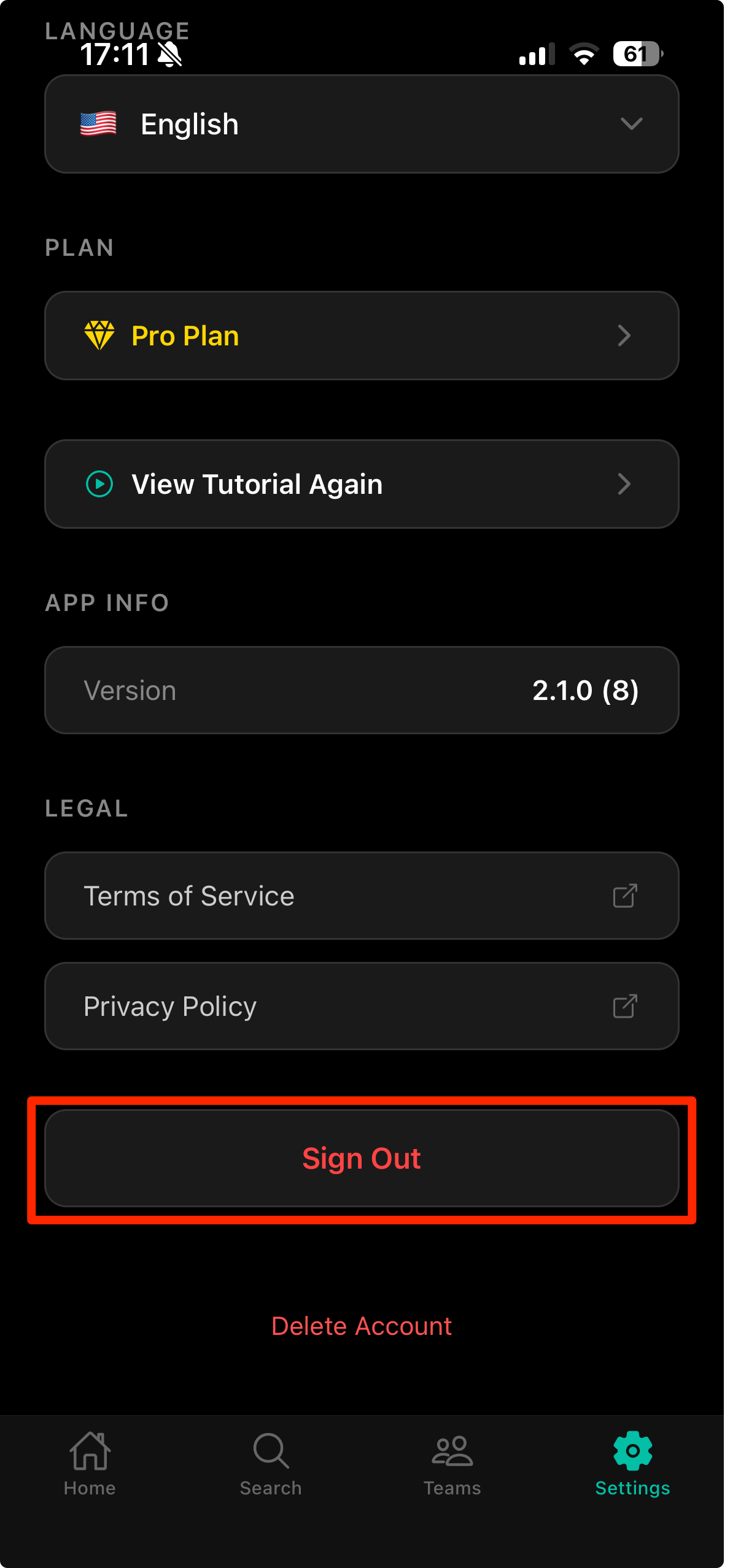 Tap 'Settings' in the footer to open the settings screen. You can check account info, change language, and view your plan.
