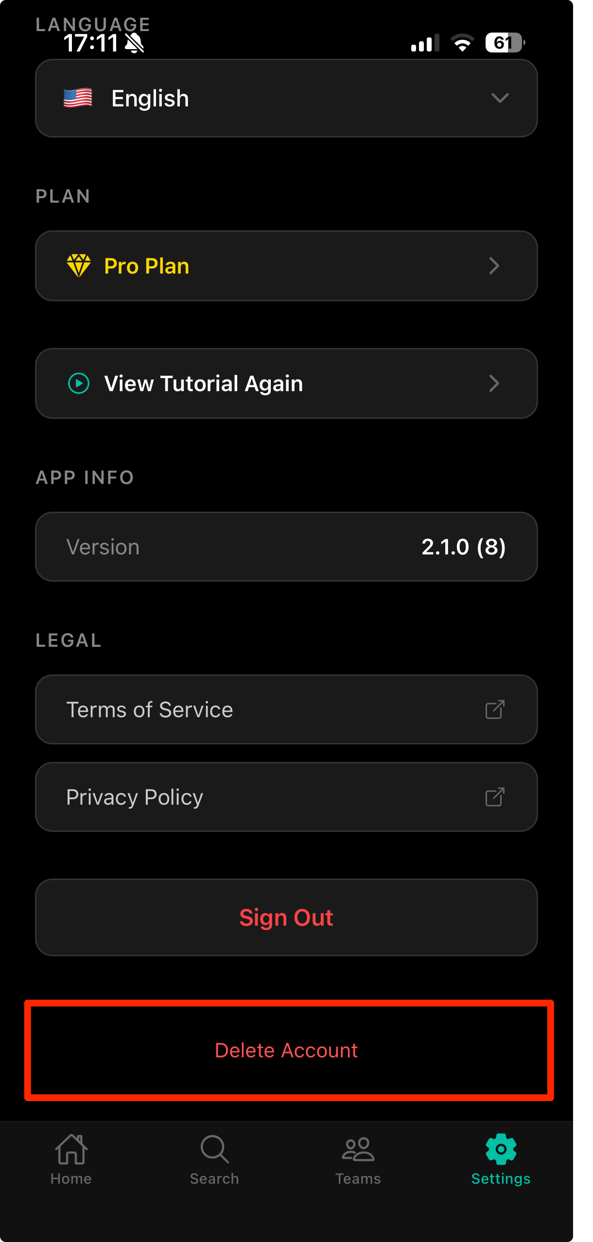 Tap 'Settings' in the footer, then tap 'Delete Account' to delete your account.