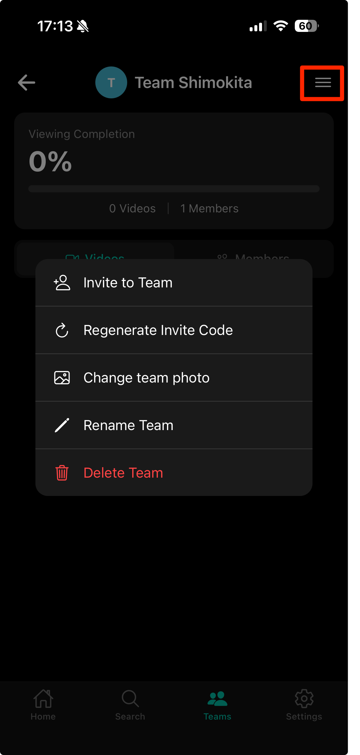 Tap the hamburger icon at the top-right of the team detail screen to open the edit menu.