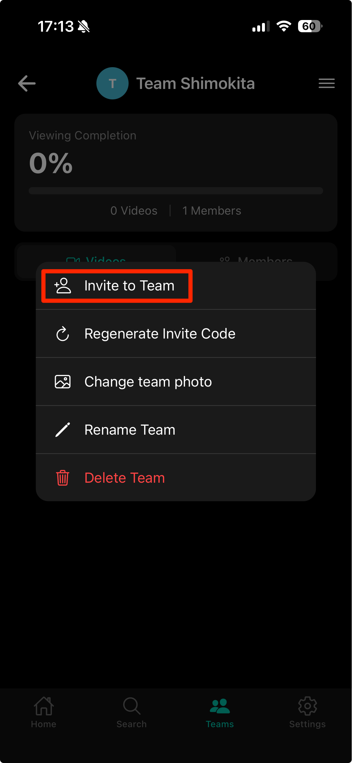 Tap the hamburger icon on the team detail screen and select 'Invite to Team'.