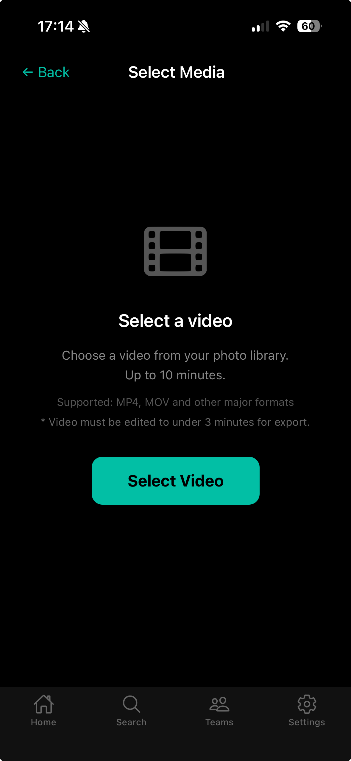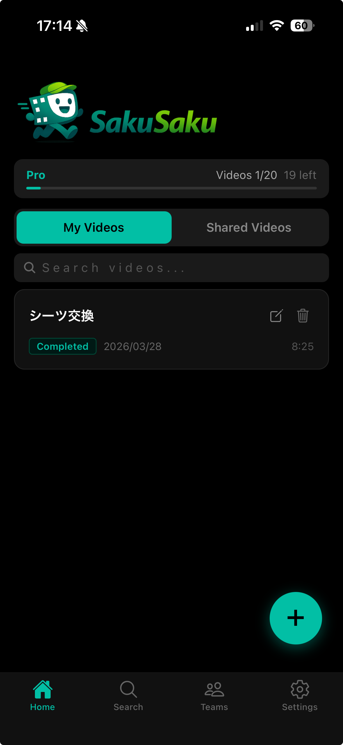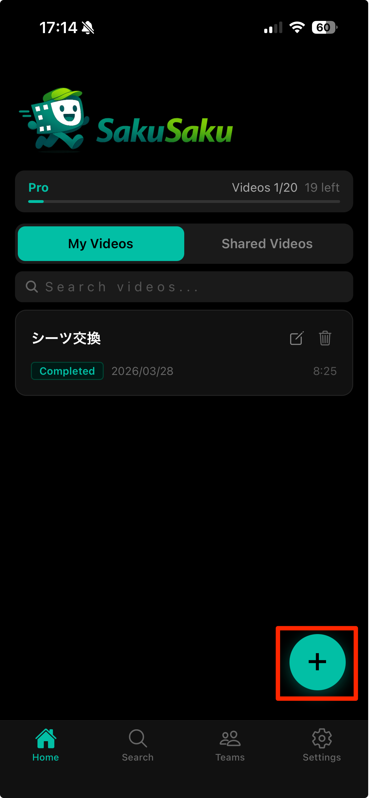 Tap the '+' icon at the bottom-right of the home screen to start creating a new video.