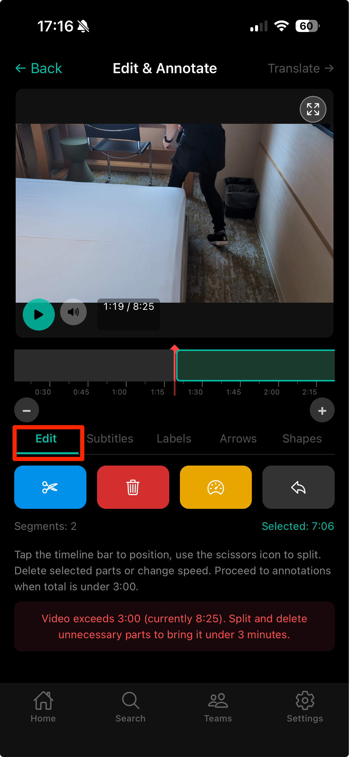 For videos longer than 3 minutes, use the edit tab to set segments and trim to the parts you need.